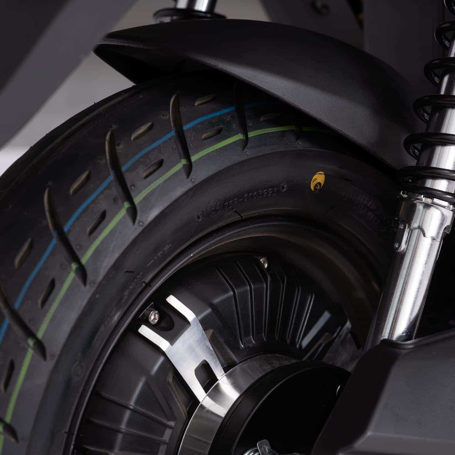 Le scooter est équipé de freins à disque à l’avant et à l’arrière, offrant un freinage réactif et efficace. Ce système garantit un contrôle optimal en cas de situations d’urgence, permettant de s’arrêter rapidement et en toute sécurité.